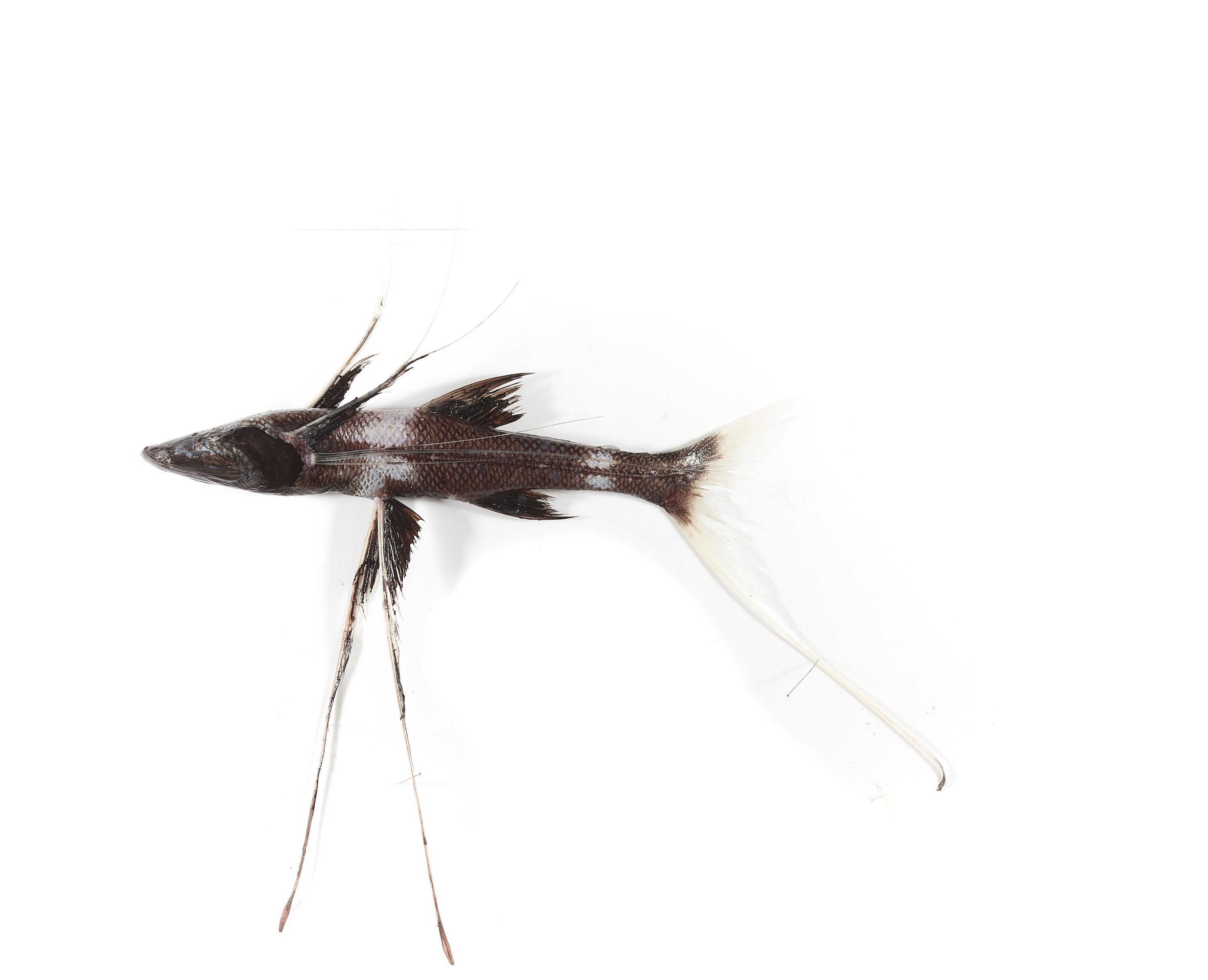 Body dark, head bluish-black with pale above, elongate pelvic and caudal fin rays.