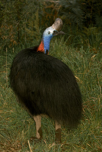 A large-bodied flightless bird with a glossy black body. Head includes bare blue and pink parts with a prominent casque, or helmet, on the top of the head. Bill and casque brown with light brown legs. Up to 58.5 kg, 1.7 metres tall.