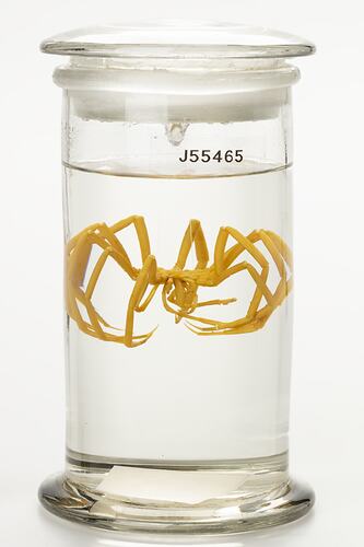 Decolopoda australis is a large, 10-legged Antarctic sea spider, that in life is a bright scarlet colour (although preserved specimens often appear yellow). Diameter exceeds 30cm.