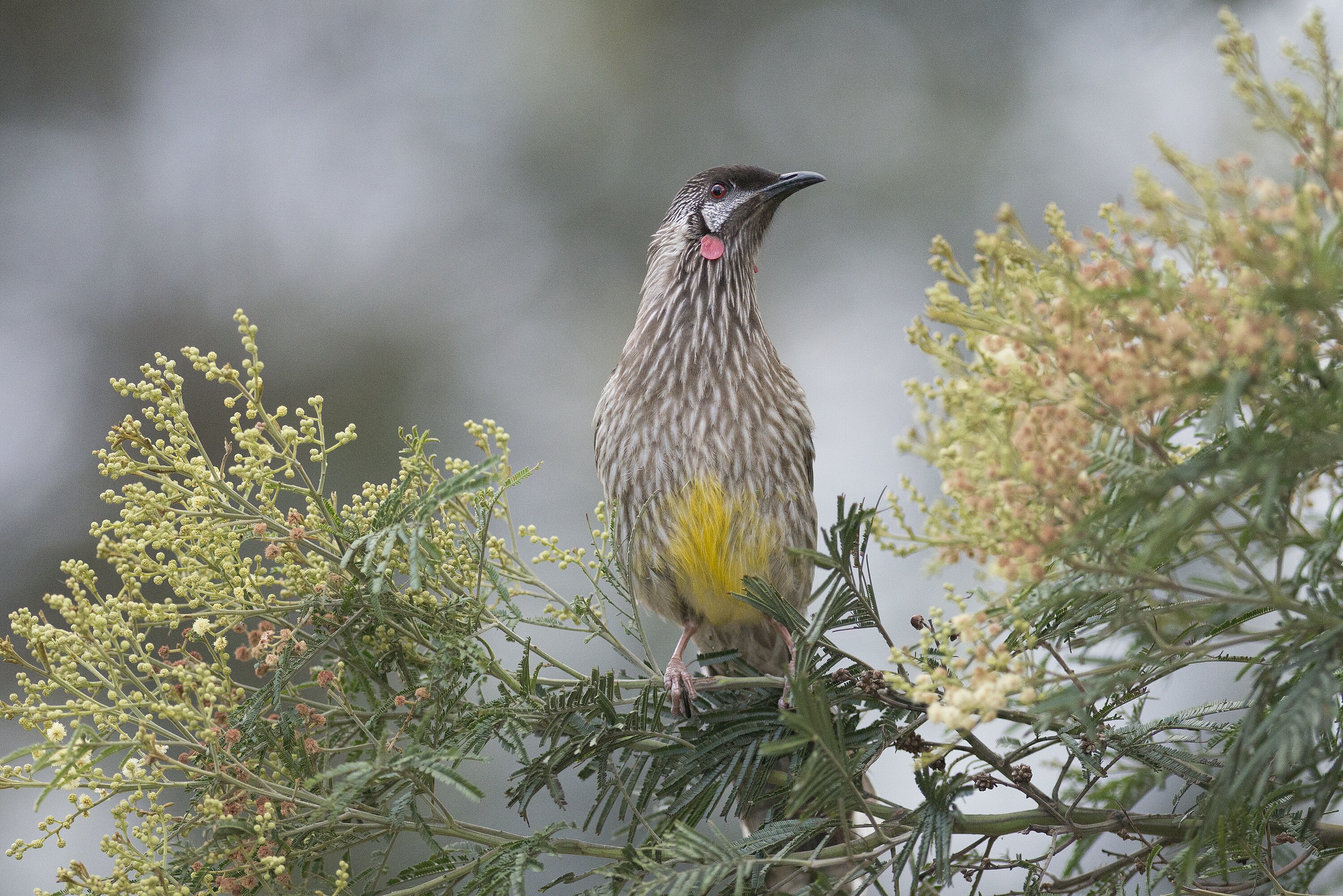 Male Red Wattlebirds call with a loud cackle, like a cough. Females respond with a whistle.