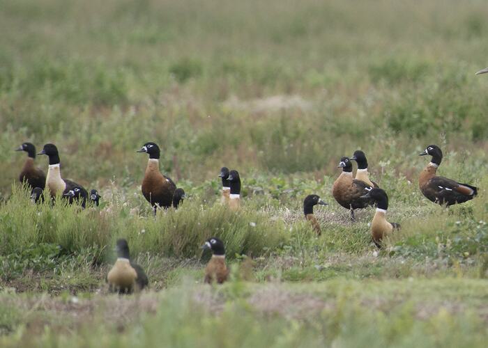 Australian Shelducks are generally found near fresh water. They graze in shallow water or on land, and also eat insects, molluscs and algae. They nest in tree hollows, rabbit burrows or holes in cliffs, and they line the nest with down. Breeding pairs are known to stay together each year and males will vigorously defend their breeding territory. Chicks leave the nest after two days, being shown through their territory by their parents. They remain as a family group for six weeks. After the breeding season, shelducks may migrate large distances northwards to wetlands where they gather in large flocks. Here they moult their tail and flight feathers, becoming temporarily flightless.