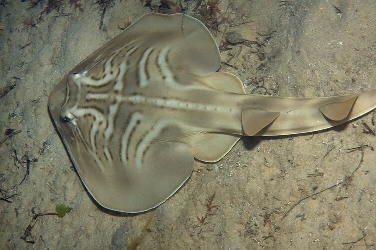 This species is common in coastal waters and is often seen foraging over sand flats and seagrass beds feeding on fishes and invertebrates. Females give birth to up to six live young which develop inside their mother in eggs and hatch before birth. Birth is usually in the autumn after a gestation of 12 months. Southern Fiddler Rays are taken as bycatch in commercial trawls and sold in small quantities. Intermediate in appearance between sharks and rays, these are primitive rays as their gill slits are positioned on the underside of their disk like head. Their tropical relatives are even more shark-like in having better defined pectoral fins. Trygonorrhina dumerilii is easily confused with Trygonorrhina fasciata which is very similar in appearance but occurs only along the east coast.