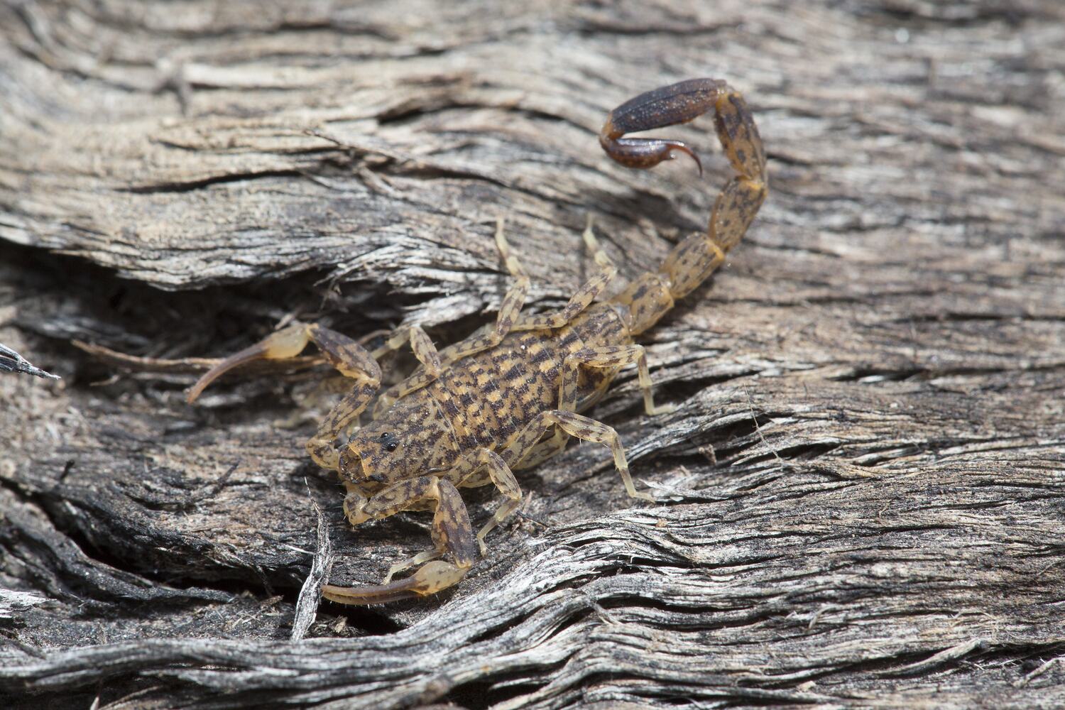 The Little Marbled Scorpion is a relatively small species and as its common name implies, has a dark brown marbling pattern on a light brown background. This marbling occurs over the body, legs and tail. Like all scorpions, they fluoresce under UV light. It is widespread in southern Australia, and is one of the three known species of scorpions found in the greater Melbourne region. It is usually found living under stones or amongst plant litter on the ground. However it is occasionally found sheltering under bark of standing trees. Unlike most scorpions, they may form groups of 10 or more animals. Little is known about the biology of this species.