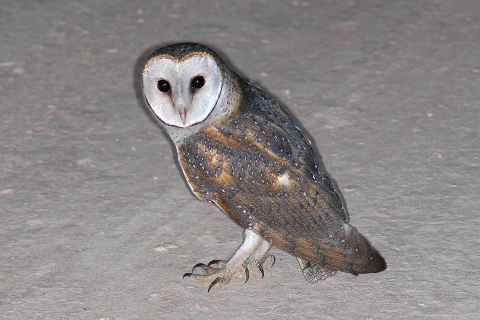 It is a moderately common bird, but generally hard to see, as it is nocturnal. During the day, the birds roost in hollow logs, caves or on concealed tree branches, emerging at night to hunt. It feeds mostly on small mammals, rats and mice, and birds, but some insects, frogs and lizards are also eaten. It uses its exceptional hearing to search for prey on the ground. The slightest sound waves are channelled toward the ears, allowing the owl to pinpoint prey even in complete darkness. Barn Owls are the most widespread of the owls, found on every continent in the world except Antarctica. It is generally a quiet bird, with the common call being a 12 second rough, hissing screech. Less frequently, birds give whistling, wheezing notes and some snapping and bill clacking during mating and threat displays.