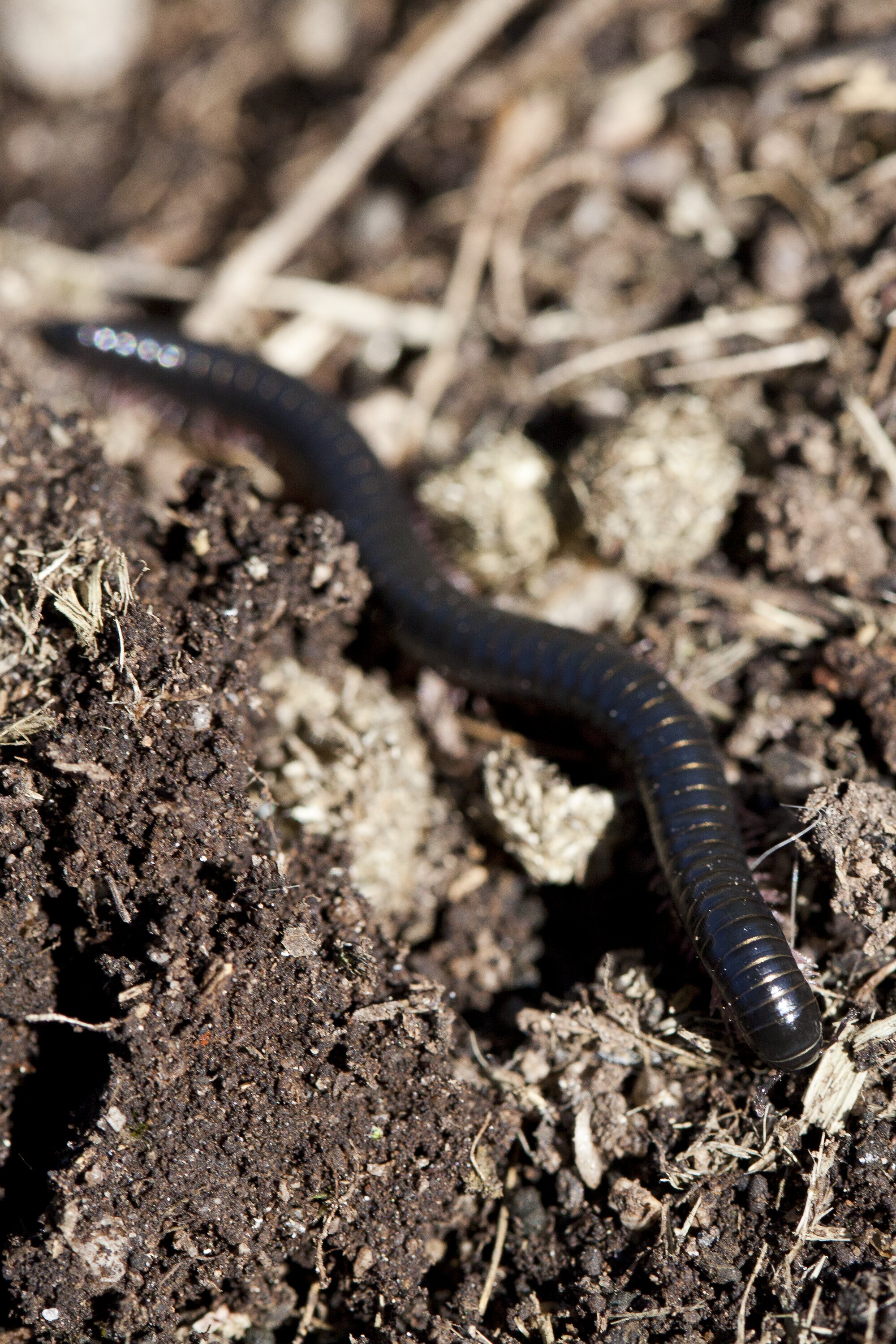 A species of millipede with 50 body segments and 2 pairs of legs on each segment. These millipedes curl up in a tight spiral or thrash around if you try to pick them up. They can also exude a distasteful chemical designed to make them unpalatable to predators. Shiny dark grey to black in colour with lighter coloured legs. The juveniles are a light grey or brown colour. Body length up to 4.5 cm.