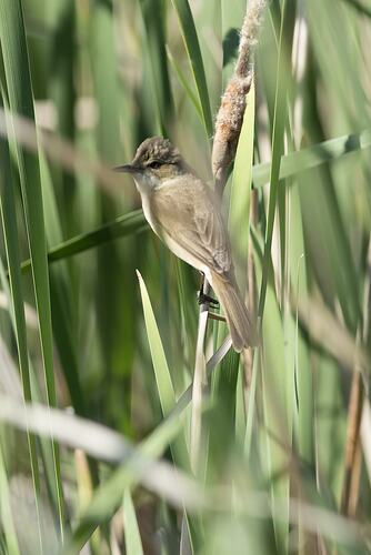 Australian Reed-warblers are a summer migrant travelling south to breed. They are often seen flying low over water or clinging to reeds. Pairs defend small breeding territories. Reeds and various other water plants are woven together to form a deep cup nest with a narrow top. Nests are lined with feathers and dry grasses and are attached to reeds. The shape of the nest is thought to prevent eggs from rolling out, even during windy conditions when reeds are bent down. The usual clutch size is three to four eggs which the female incubates. They perch low down on reeds or on floating vegetation to catch insects. Males call frequently during the breeding season.