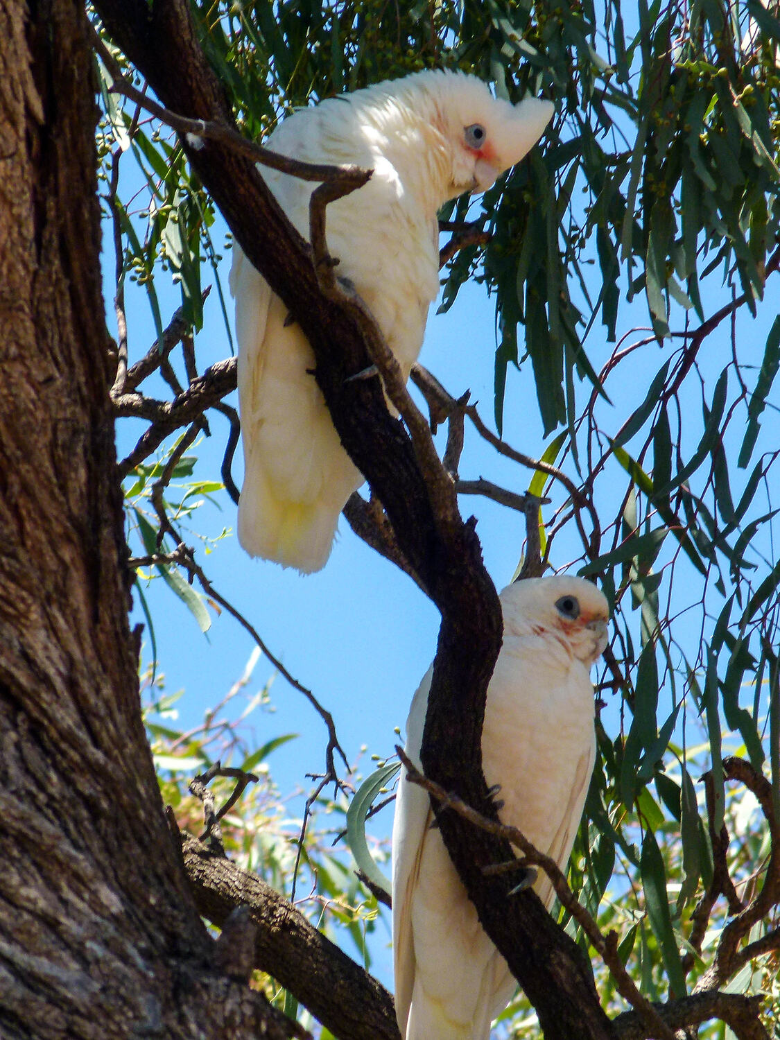 A stocky, medium-sized cockatoo. Mostly white, with pale yellow of varying strength on the underside of wings and tails. Pale pink between edges of the bill and eye, sometimes joining across the top of the bill in strongly-coloured birds. Feathers of head, neck and breast have pink bases, rarely seen but sometimes become visible when ruffled by wind or preening. Short, pale bill in comparison to other corellas. Up to 40 cm long; wingspan to 100 cm.