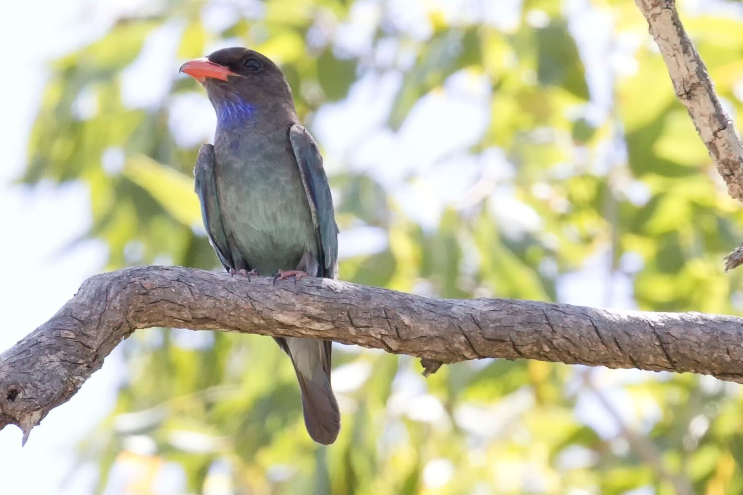 Dark brown body, blue-green wings and back, short orange red bill.
