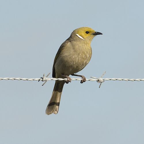 Common medium-sized honeyeater. Upper parts yellowish olive-grey; pale brown-grey below. Head is mostly yellow, with a white neck plume, bordered above with black. Wings are mostly brown above, with olive or olive-yellow edges. Length 16 cm; wingspan to 23.5 cm.