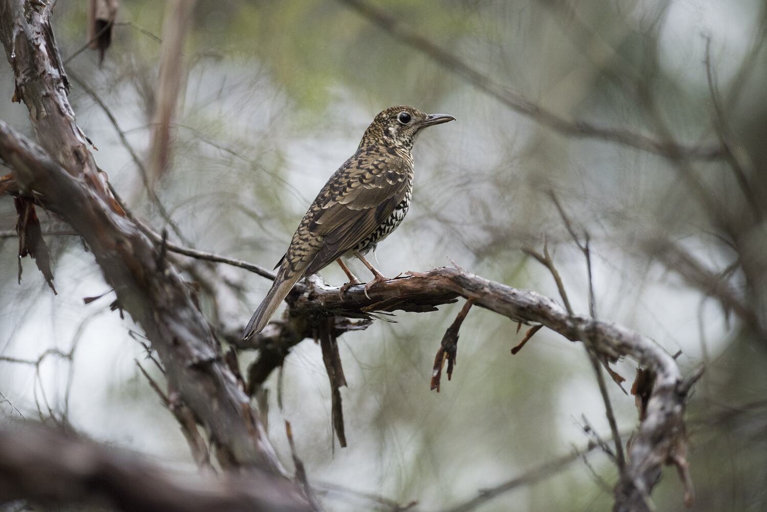 A medium-sized bird with grey brown or copper brown body. The Bassian Thrush has a white ring around the eye and black bars on the back. Feathers of breast, throat and flanks are edged in black scallops. Dark brown eye. Female slightly smaller than the male. Pale wing bars in flight. Body 29 cm.