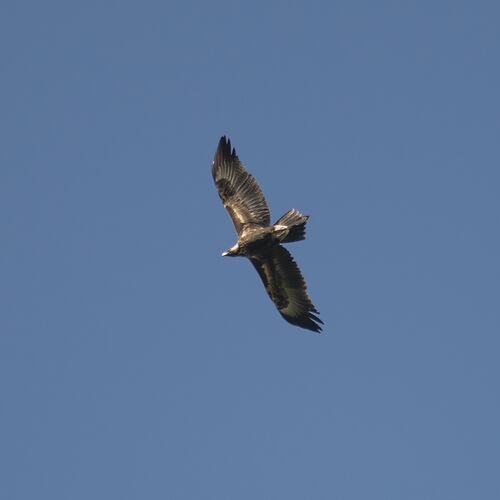 Body dark brown with wings and neck paler (adult) or paler with gold sheen (young birds). Feathers extend all the way down the legs. Characteristic tail is long and diamond-shaped, looking like a wedge when seen from below. Wingspan up to 2.3 m. Females are larger and heavier (over 5 kg) than males (up to 4 kg). Body length up to 105 cm.