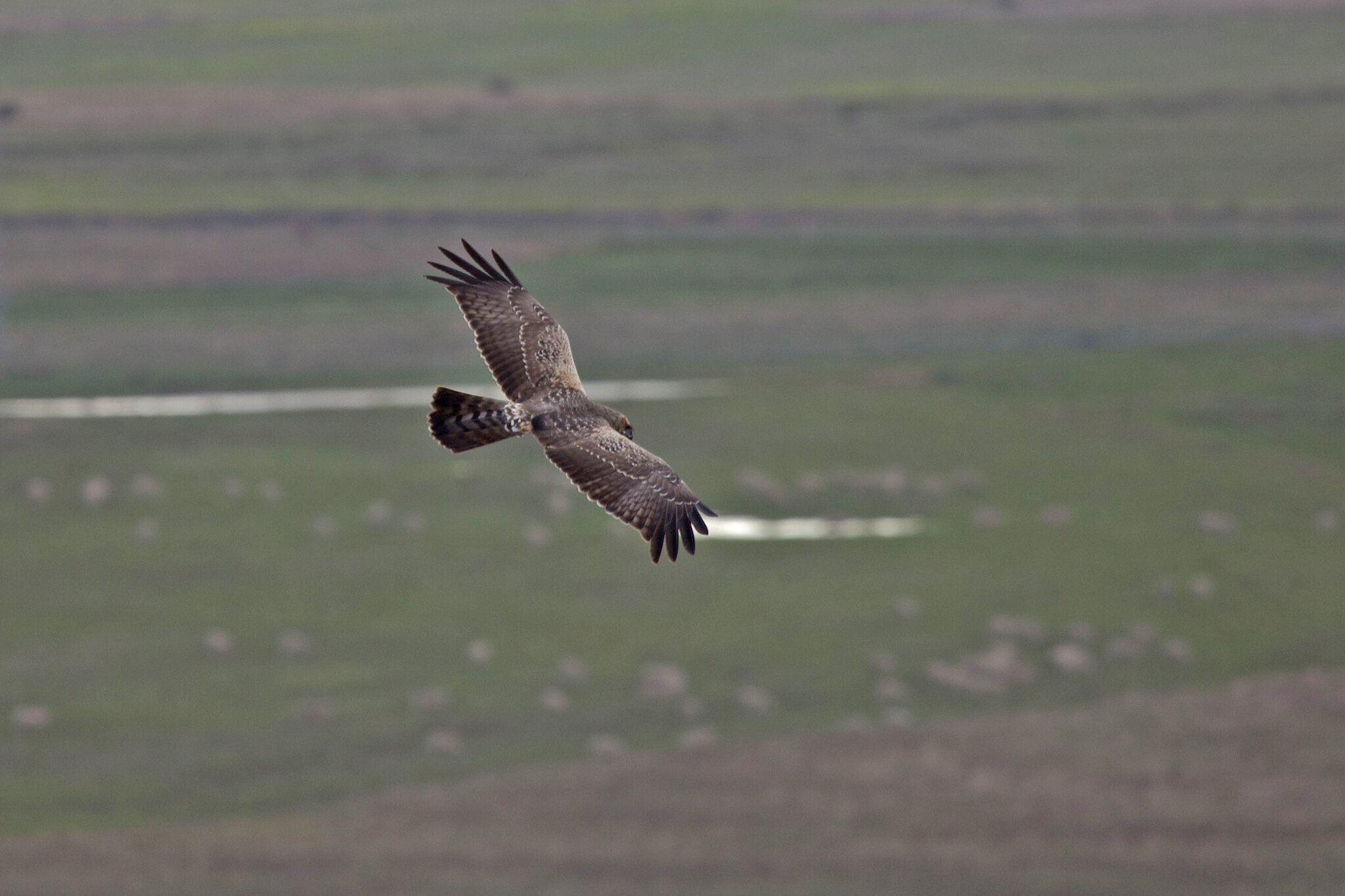 A dark brown raptor with an obvious white patch on the rump. When gliding, the wings form a 'V' shape.