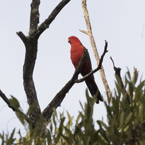 Australian King-parrots are usually seen in pairs or small flocks. They forage mostly in trees, feeding on fruit and eucalypt and acacia seeds. King-Parrots nest in deep tree hollows, laying their eggs on a layer of decayed wood-dust. The nest entrance is high in the tree, while the nest and eggs are quite close to the ground. The clutch size is usually three to five eggs. They are largely sedentary. Australian King-Parrots are becoming more common in suburbs containing lots of trees and will feed at supplementary food tables and fruiting trees in urban areas.