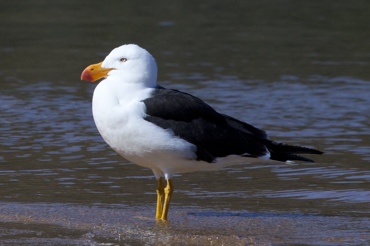 A large white gull with black wings and back. The tail is white with a wide black band near the tip. They have a massive yellow bill with a red tip. Legs are yellow. Immature birds have a dark brown body with mottled pale brown on the upperparts and a dark brown bill. Body up to 66 cm long. Can be confused with Kelp Gulls, Larus dominicanus, but these are smaller than Pacific Gulls, have an all-white tail and a red tip on the lower bill only.