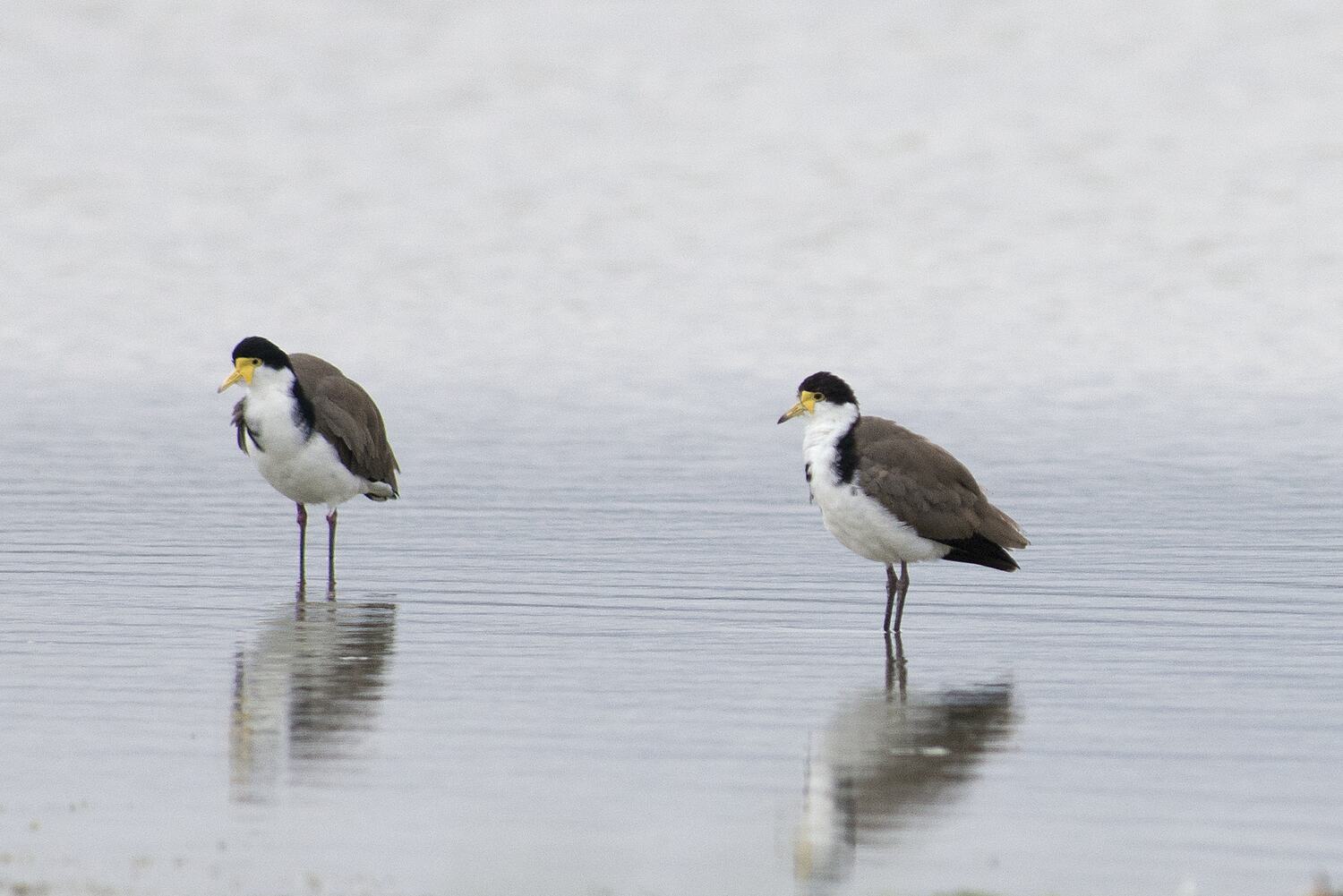 Masked Lapwings have a light brown upper body and white underparts. The back, top of head, sides of breast and wing tips are black. The bill and large wattles hanging from the face are yellow. They have thorny yellow spurs on the elbows (carpal joint) of the wings. Bill to tail length up to 38 cm. Juveniles have a darker back and no wattles or wing spurs.