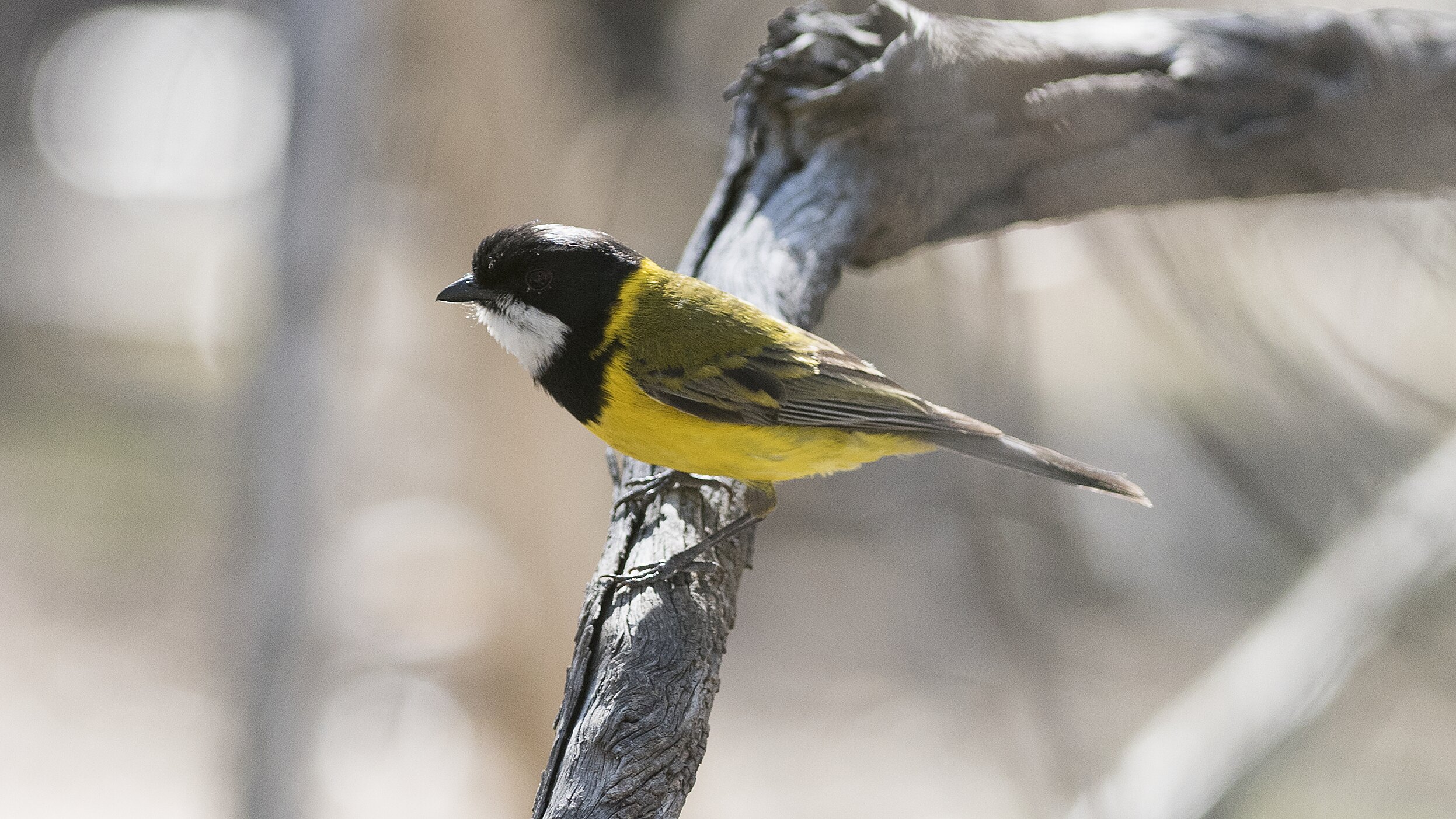White throat, black top of head, yellow underneath.
