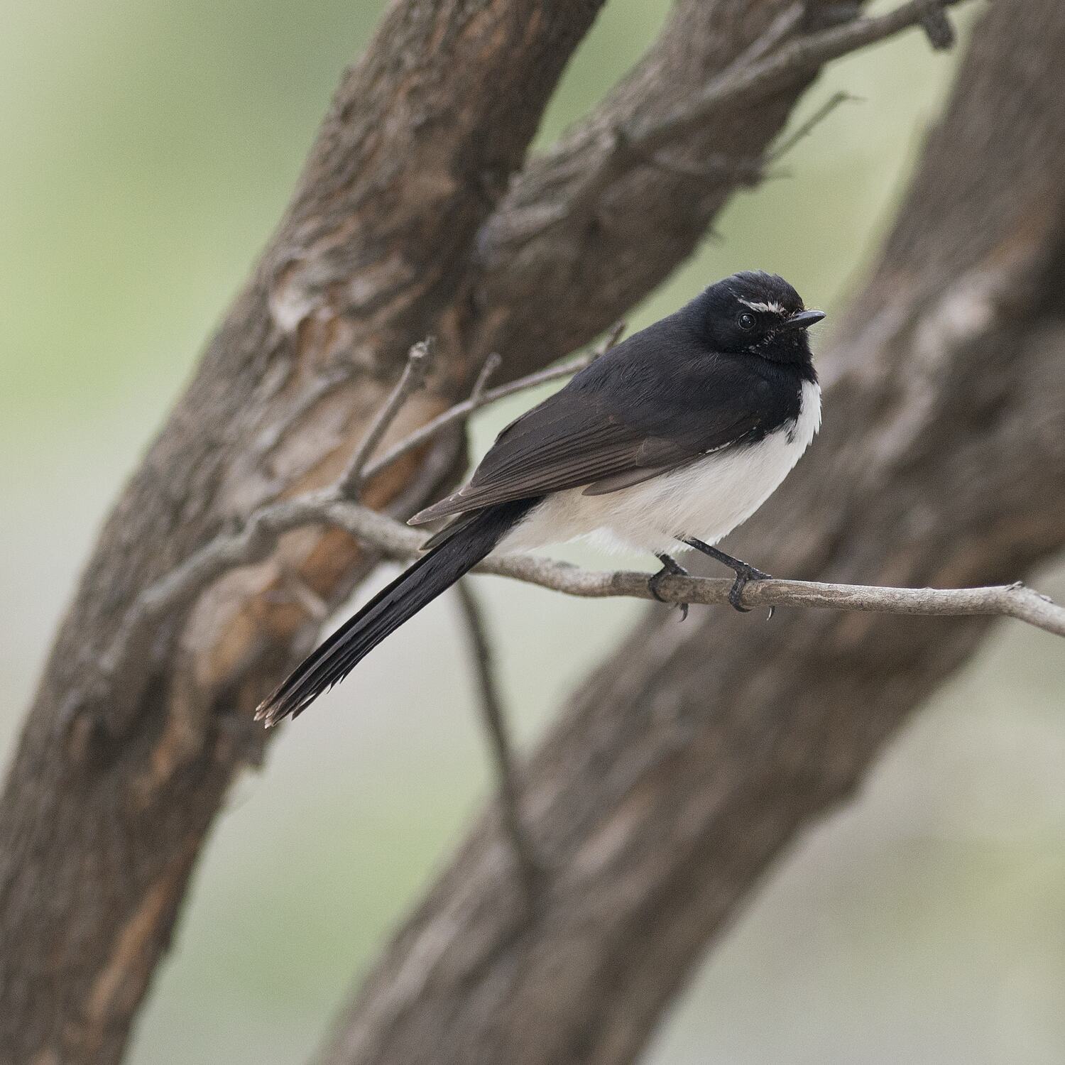 Willie Wagtails are usually found singly or in pairs. They can form winter flocks mixed with other species. They catch insects on the ground or in flight and will follow or perch on livestock, catching insects disturbed by their movements. They sometimes eat small lizards. They are highly territorial and call repeatedly at night during the breeding season to advertise their territory. Their nest is a neat, shallow woven cup constructed from grasses lined with soft grasses, hair, feathers or fur plucked directly from animals. The outside is covered in spider webs. Nests are built on a horizontal branch and are re-used over multiple years. A breeding pair can raise up to four clutches of eggs in a season. Young birds remain with their parents until the eggs from the successive clutch hatch. They are Australia's largest fantail.