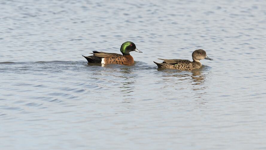 A small duck that feeds by dabbling and upending. Males are chestnut with a green head, females are mottled brown.