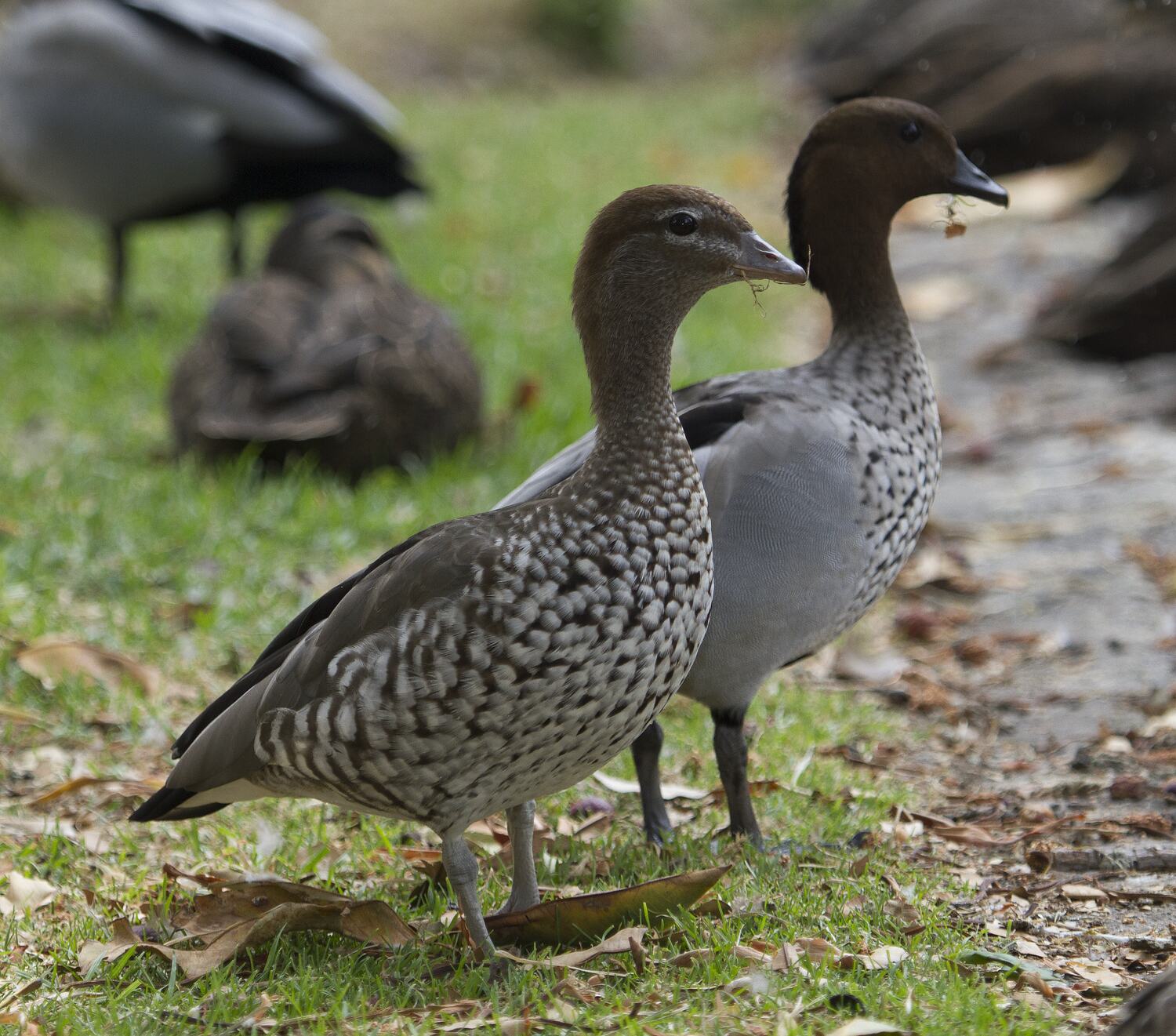 A grey and brown duck with small dark spots on breast, an upright stance and a small bill. Often seen grazing on land rather than feeding in the water.