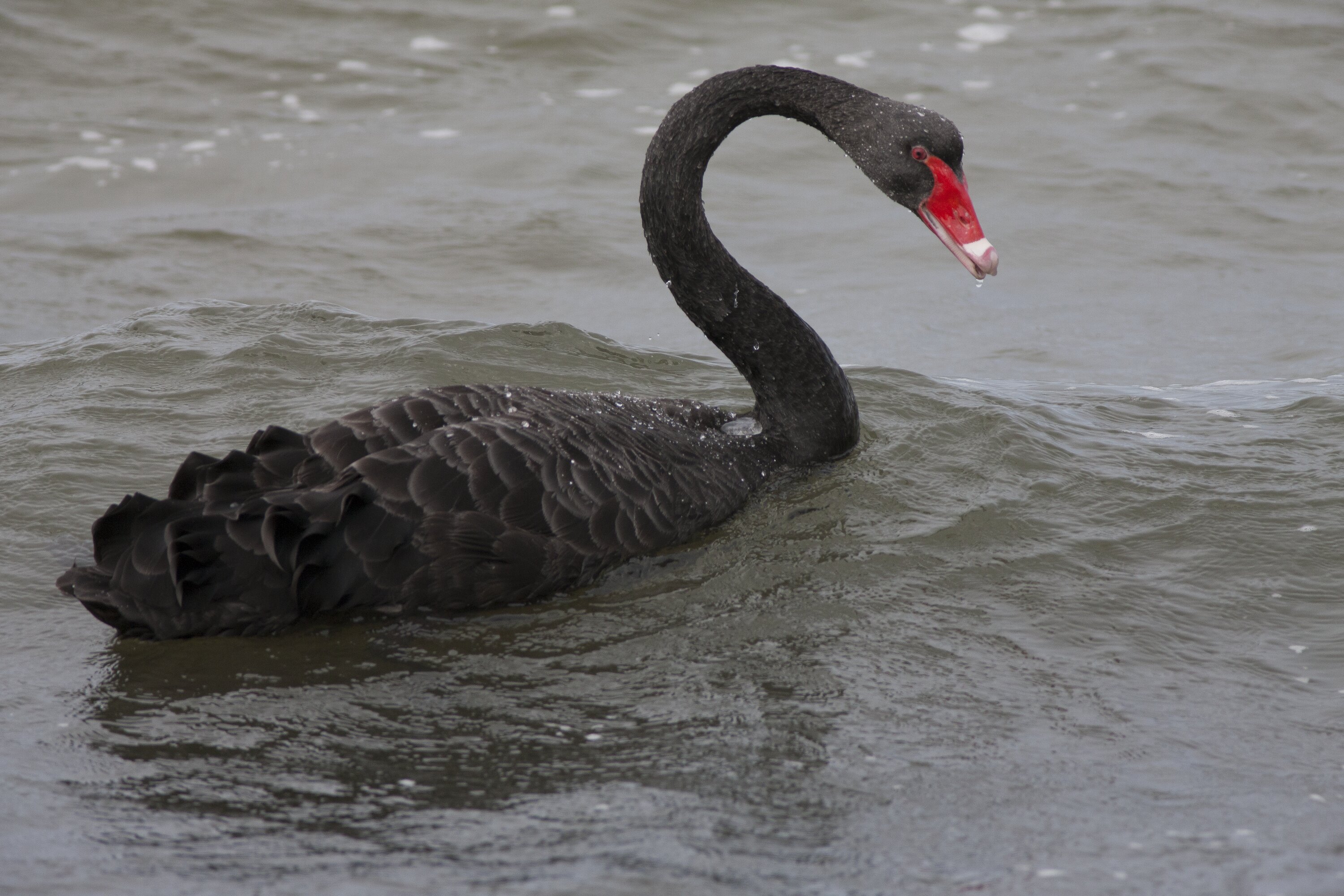 The feathers are all black except for the outer wing feathers; these are white and are easy to see when the birds are in flight but are hidden when the wings are folded. Black Swans have a long thin neck. The bill is red with white near the tip, and is slightly hooked. The feet are webbed. Bill to tail length is up to 140 cm, of which the head and neck are about half.