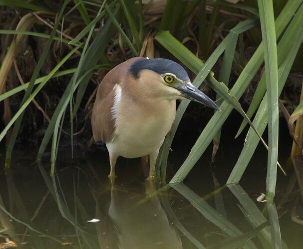A reddish-brown coloured heron with yellow legs and white streamers on the head. Often stands stooped by the water's edge looking for prey.