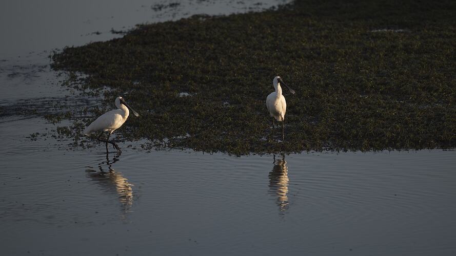 Spoonbills feed by sweeping their bill sideways through shallow water to search for crustaceans, aquatic insects and fish. When prey is caught, they lift their bill up allowing food to slide down their throat. Shells of crustaceans are removed by banging them against a hard object. Spoonbills can feed by night or day and in muddy waters due to sensory structures on the inside of their bill that detect vibrations given off by prey. During the breeding season, they form monogamous pairs and nest in colonies with other waterbirds. Their white head plumes are erected during courtship displays, revealing bright pink skin. Bowl-shaped nests made from sticks are re-used each year, usually built in the top of trees over water or amongst reeds. They are highly sensitive to disturbances while nesting; parents will fluff up their feathers when threatened to appear larger than they are.