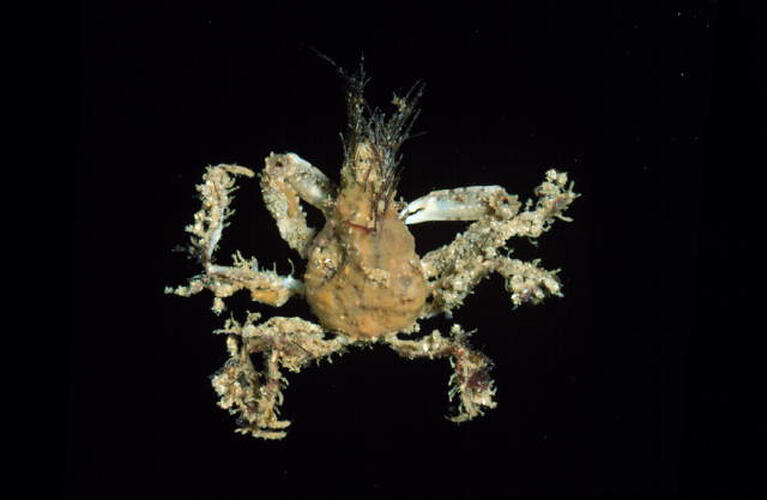 A common seaweed crab among subtidal algal beds of sheltered shores. These crabs have small hooked hairs on their carapace to which they attach bits of seaweed, sponge or bryozoan. Underneath the camouflage the crab is yellow-brown and males have stronger claws than females. They feed on other invertebrates.
