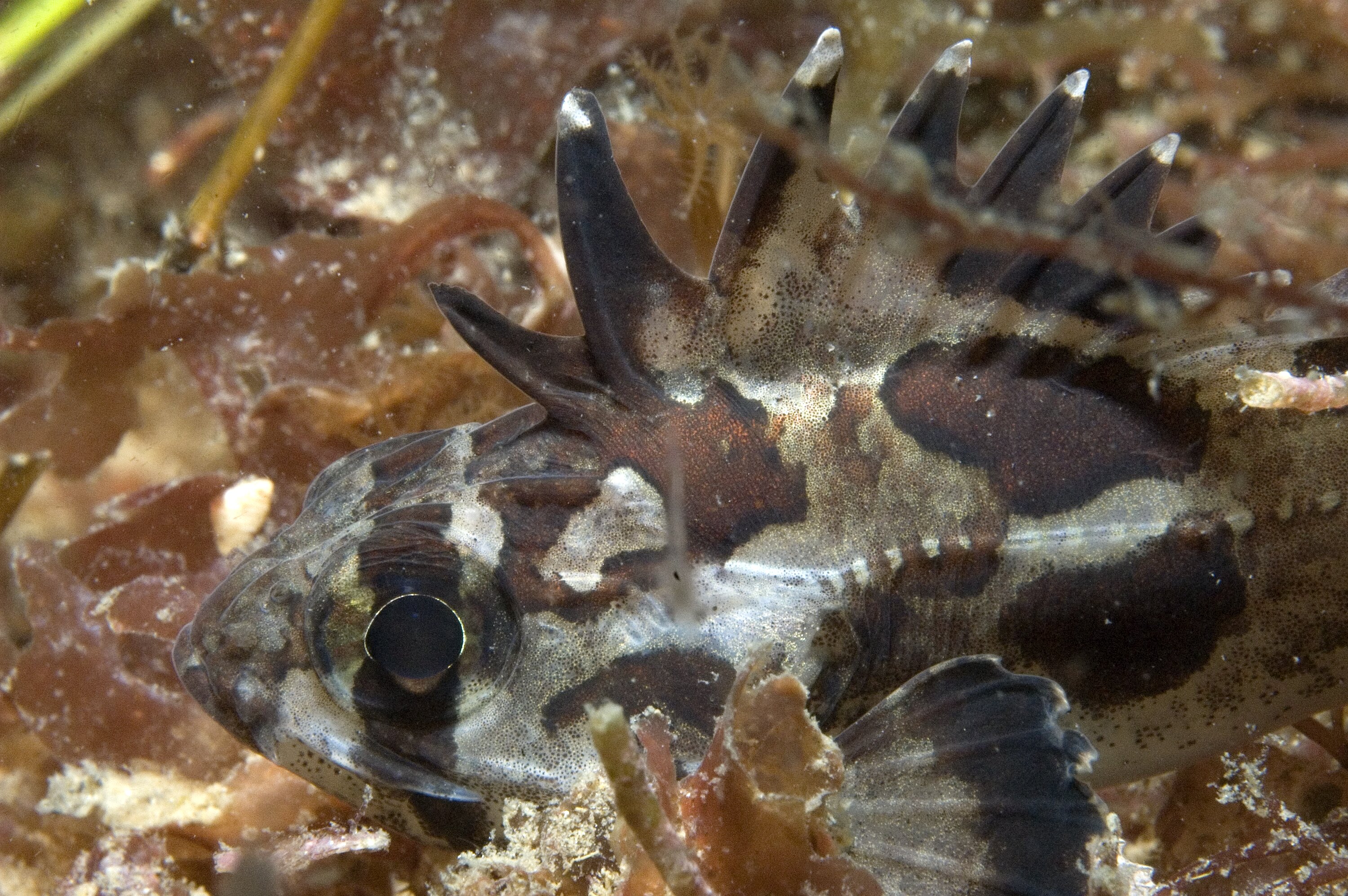Pale brownish with dark markings, a dark blotch on dorsal fin, large spine on each side of snout below eye, scales absent.
