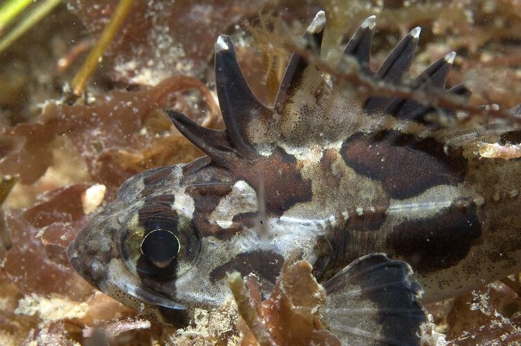 Moderately long body without scales. The dorsal fin is long-based with notched fin membranes on the spiny part. The pectoral fins are large. There is a stout curved spine on each side of the snout below the eye; the spines can be locked forwards. Pale mottled brown in colour with large irregular darker patches, a dark blotch on the spiny dorsal fin and a dark bar through the eye. Body up to 22 cm (usually around 15 cm).
