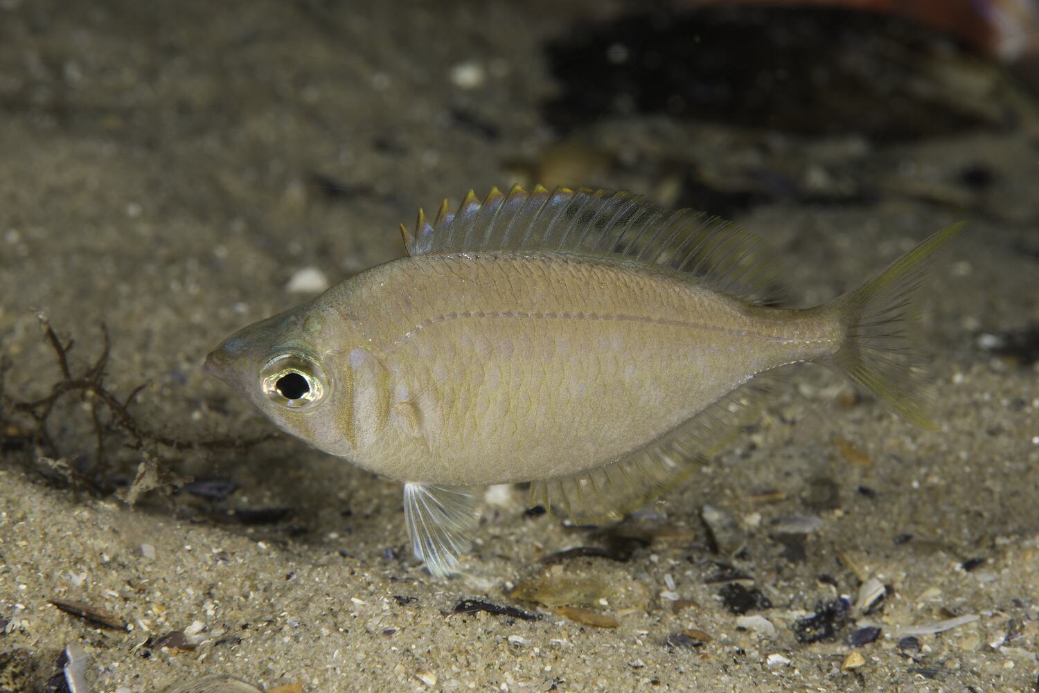 Body deep, compressed, forehead convex, snout pointed with protrusible jaws; dorsal and anal fins long based, low at front, progressively becoming taller; tail base slender, caudal fin slightly forked. Silvery, darker above, scales with blue and yellow on lower scales, dorsal fin with a yellow margin. Usually 10 cm long head to tail tip (up to 21 cm).
