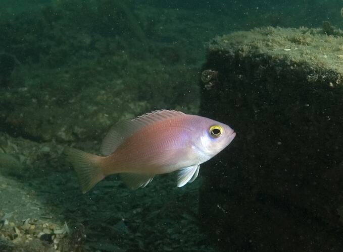 Oval body, rather short head with small mouth, and long-based dorsal fin without a distinct notch. Adult males are bluish with a black bar on the side. Females are pinkish with a blue line below the eye. Small juveniles are pink to pinkish-orange with a dark mauve head. Usually 15 cm long head to tail tip (up to 25 cm).
