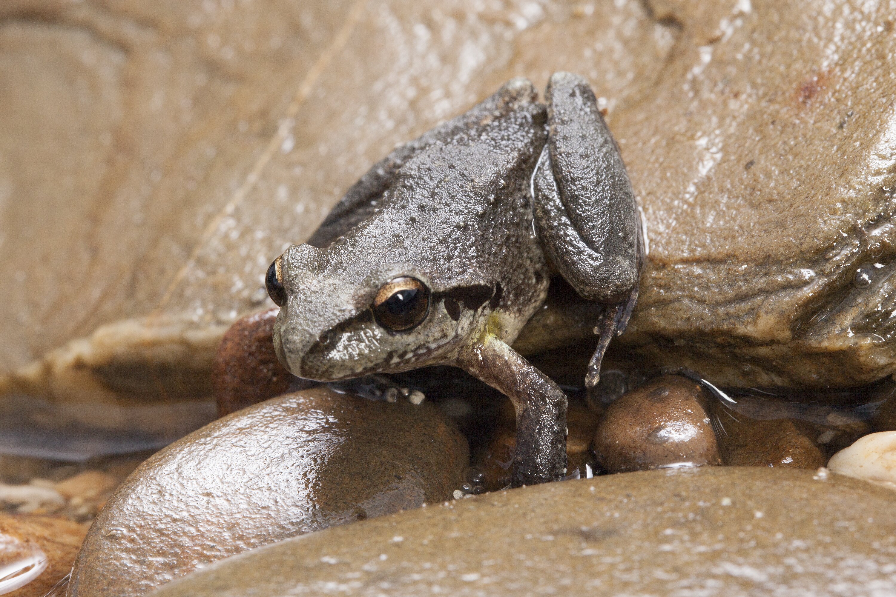 Medium sized frog with stripe through eye and black and yellow patches on groin and legs.