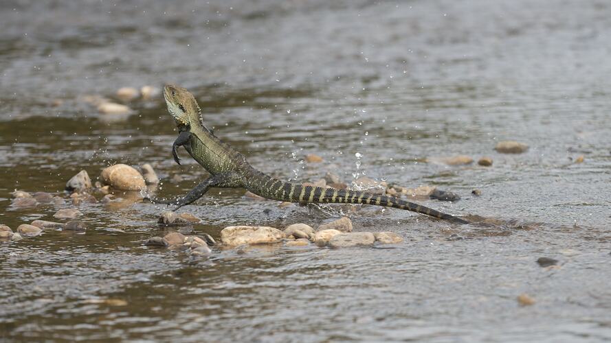 Eastern Water Dragons are active during the day, feeding on a range of plants and animals. They are often observed perched on fallen trees, logs or rocks beside flowing water. When startled, they will dive into the water where they can remain submerged for up to an hour. Females lay a clutch of 6-17 eggs.
