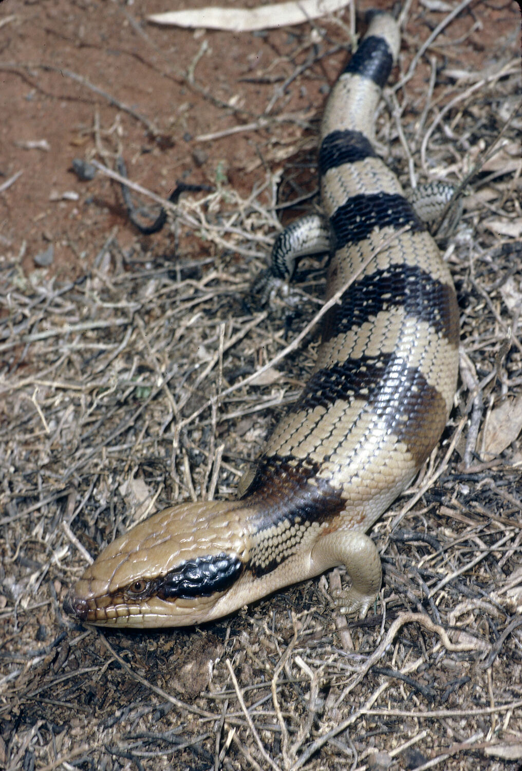 Western Blue-tongues are slow moving animals. They are omnivores, eating plants, flowers, fruits, snails and small vertebrates. When threatened they hiss and stick out their tongue. Females give birth to live young.