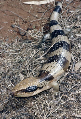 Body yellow-brown to grey with wide dark brown stripes across the body and around the tail. Dark stripe through the eye. Up to 32 cm long (snout-vent).