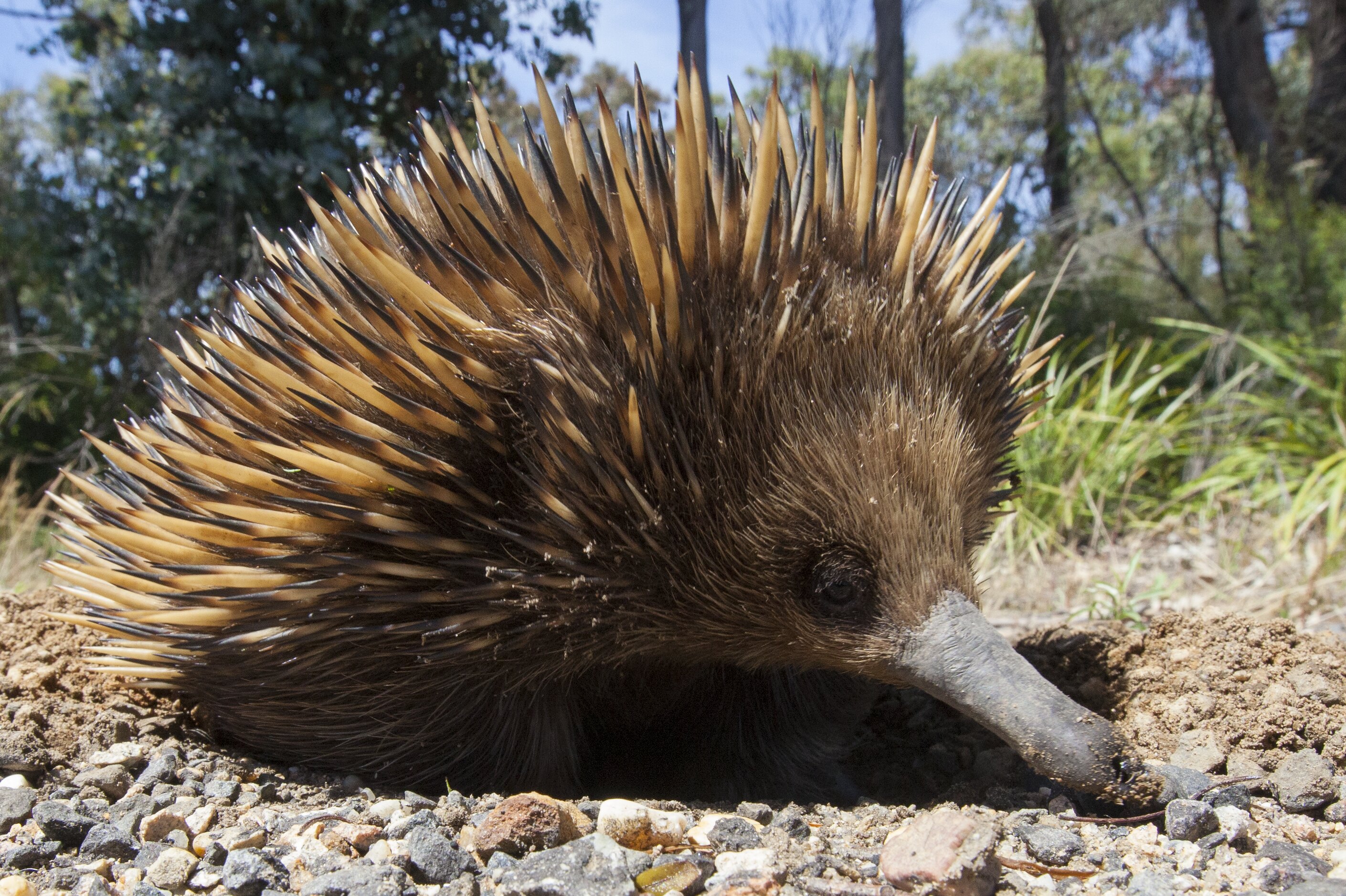Short-beaked Echidnas have one of the largest ranges of any Australian mammal and are found in almost all terrestrial habitats. Short-beaked Echidnas capture ants, termites and other small invertebrates using a long, sticky tongue. They grind this food on horny plates in the mouth. Females lay eggs and feed their young on milk. They like to shelter in mulch piles and sometimes leave their babies in piles of leaves in people's backyards. They are often spotted at dusck but can be seen at any time of day.