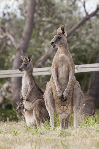 Eastern Grey Kangaroos feed mainly on grasses and herbs, but sometimes eat leaves from trees and shrubs. They are active mostly from dusk to dawn, often in large groups (mobs). At birth kangaroos are about the size of a jelly bean, blind and hairless, they are known as neonates at this stage. They crawl into their mother's pouch where they continue to develop until they emerge some months later as a joey. Eastern Grey Kanagroo joeys leave the pouch permanently at around 44 weeks old. The females start breeding at around 18 months old and can breed all year round, though young are mostly born in the late autumn and early winter.