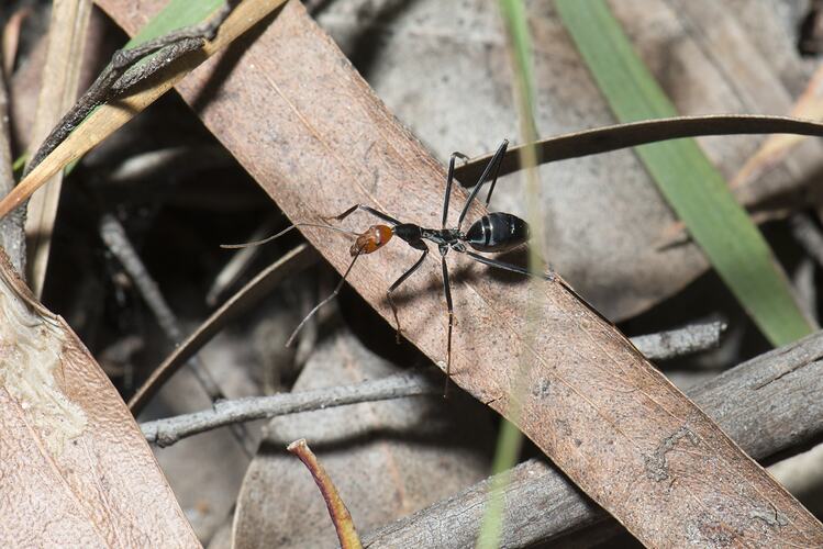 Ant with black body, orange head, long thin legs superficially resembling a spider.