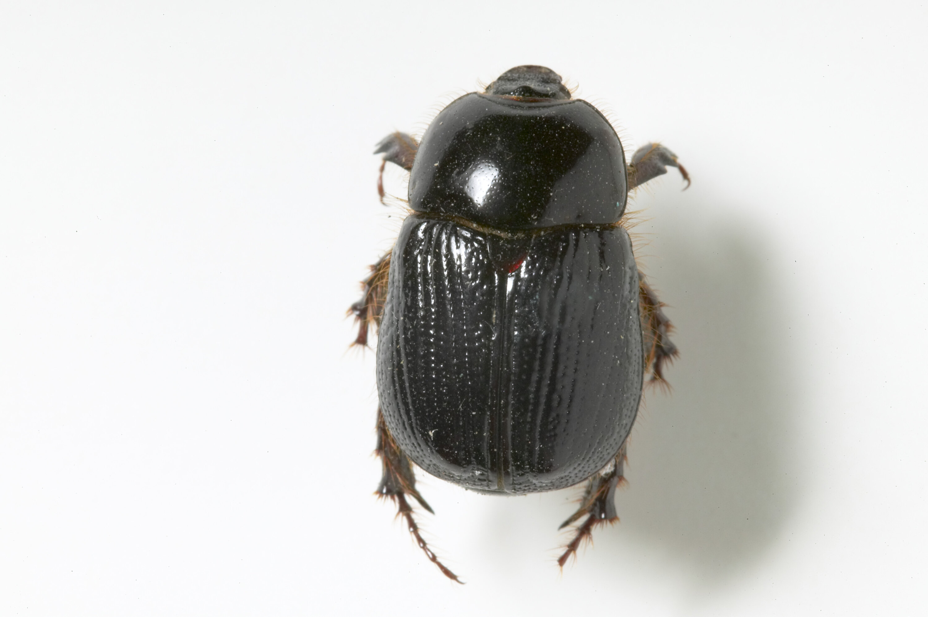 Rounded body, dark brown, spiny legs.