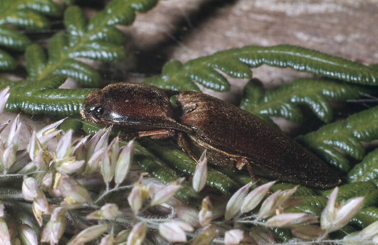 Body flat, long and dark brown. A click sound is produced when they flick into the air. Up to 2 cm long.