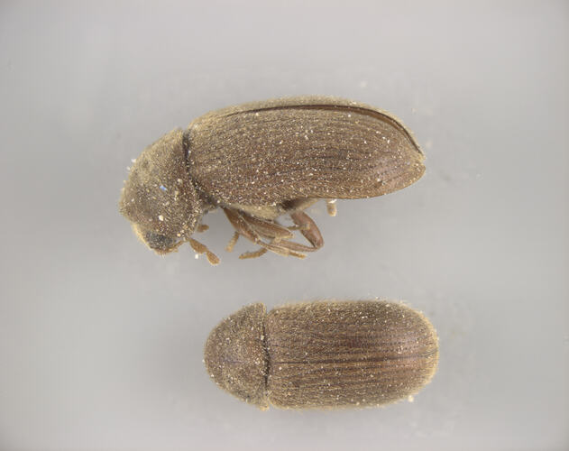 Body straight along the sides and red-brown with lines along the wing cases (elytra). Head is tucked under body and not visible from above. Antennae have three enlarged segments at the tips. Larva: small and white. Body up to 4 mm long.