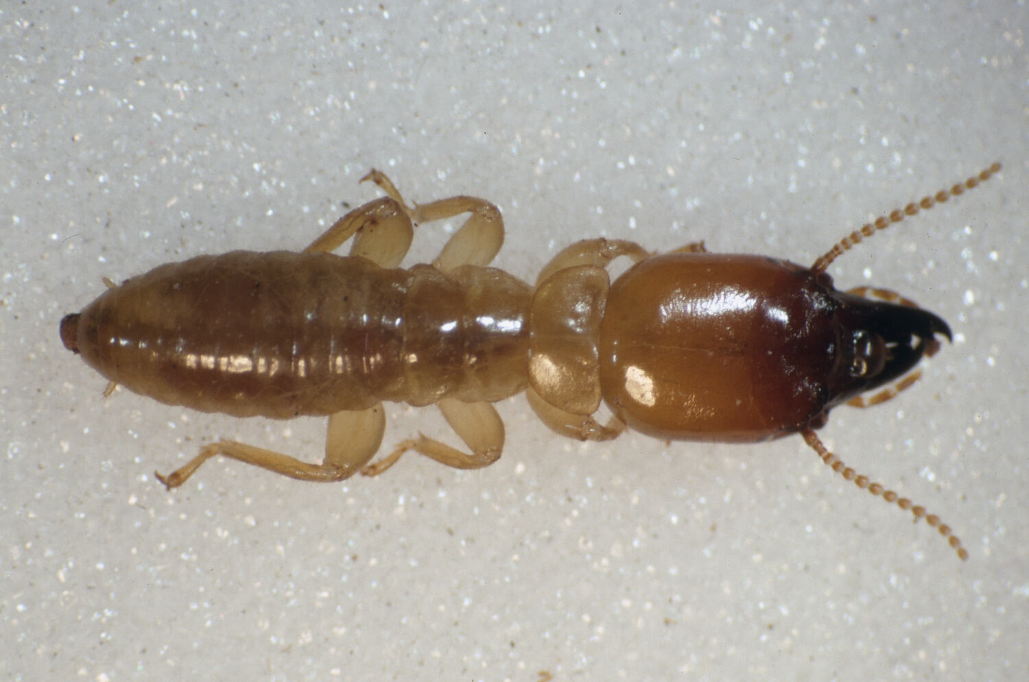 Head orange and rectangular with black, toothed jaws (mandibles). Body up to 2 cm long.