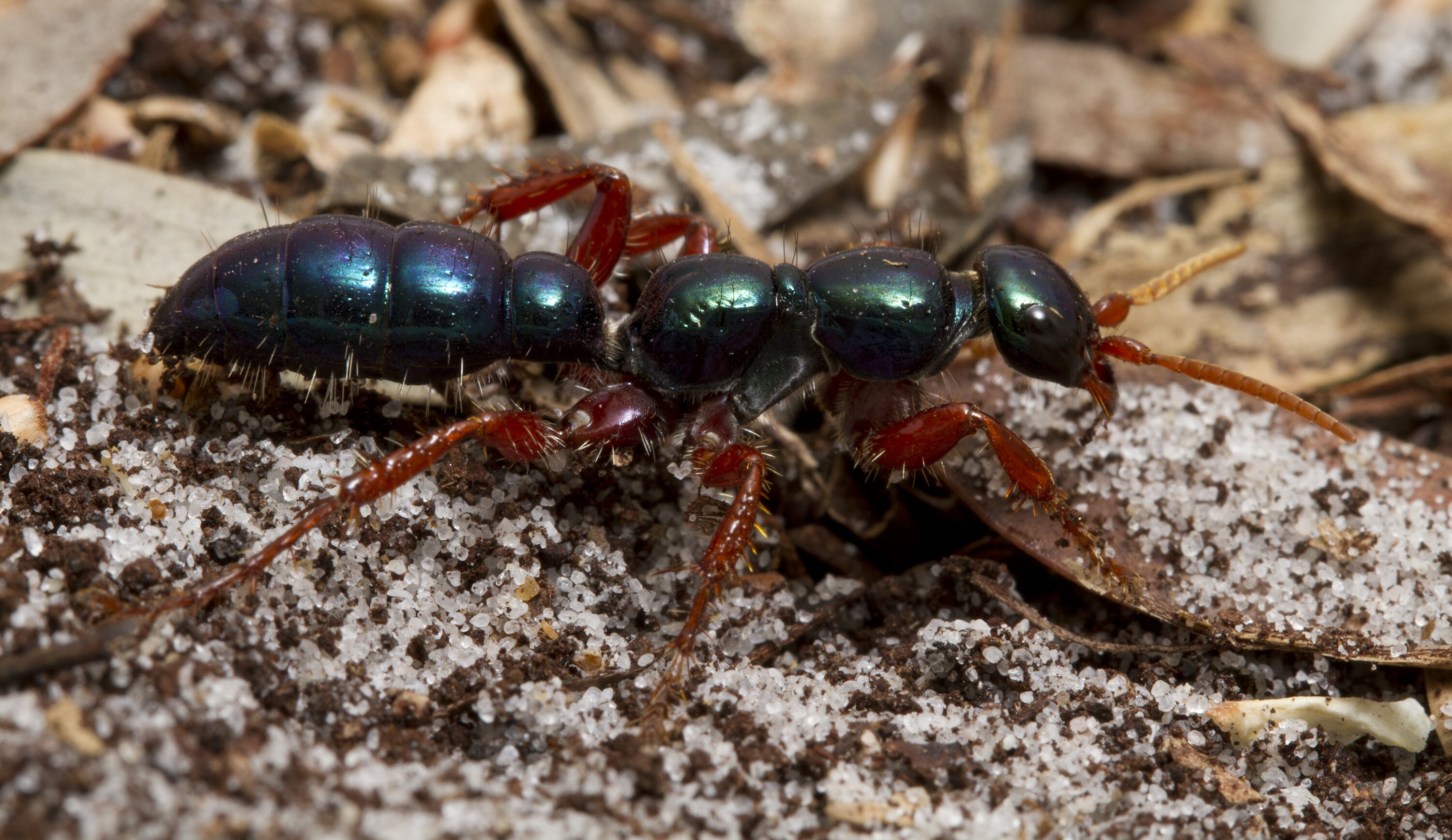 Despite their name and the ant-like appearance of the females, Blue Ants are actually wasps. Female Blue Ants live on the ground, running around with jerky movements and a raised abdomen, searching for young mole crickets in soil to paralyse and lay an egg on. The larva hatches from the egg and feeds on the live cricket. Females have a painful sting. Males visit flowers to feed on nectar.