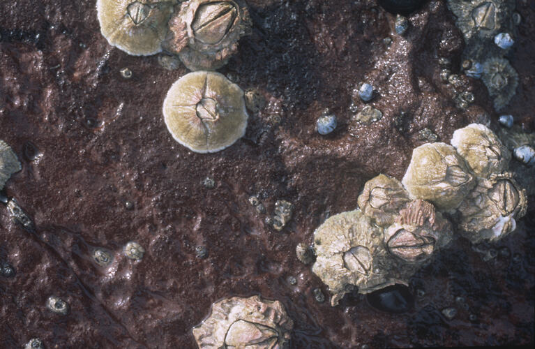Four side plates, forming a wide conical shape. Colour varies from grey-white in young animals, to pink in older animals. Opening pentagonal shape. Up to 1 cm high, 3 cm wide.