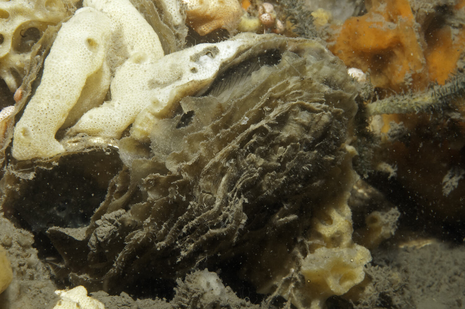Large shells, rounded with the left valve somewhat concave and the right quite flat. Valve surfaces have a flaky, layered (lamellose) appearance, and crumble easily (friable). Valve margins are undulating. Shell up to 18 cm across.