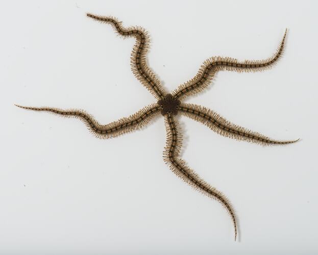 Disc covered in minute scales, 4 spines per arm segment, dark stripes around arms.