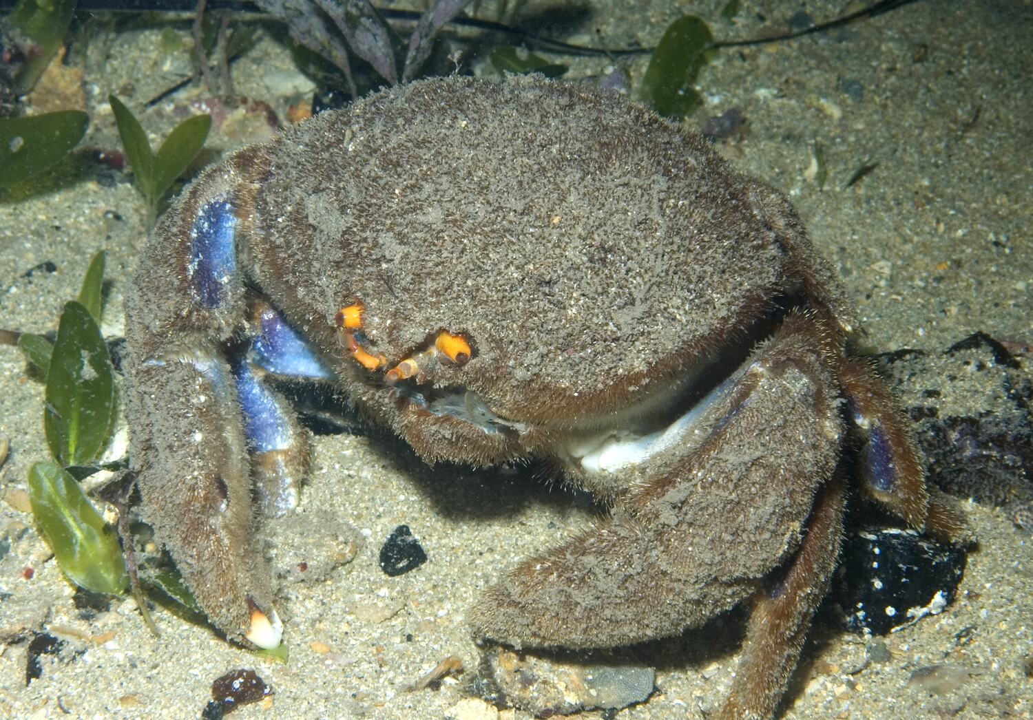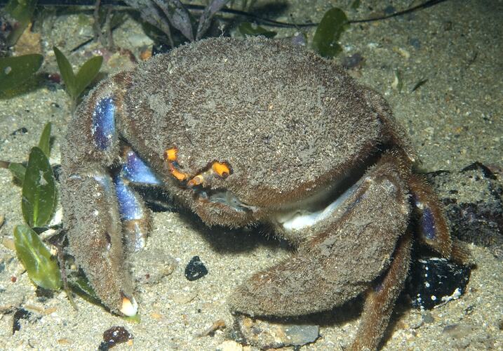 Body covered by dense, brown hairs. Carapace rounded. Eye stalks orange and parts of legs blue. Up to 8 cm wide (carapace).