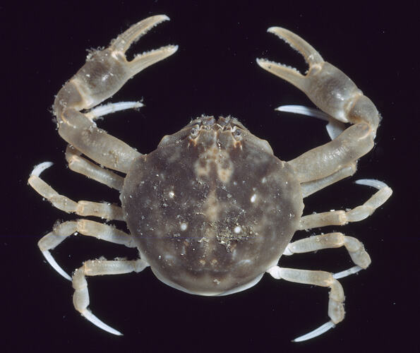 Body smooth, circular, with three slightly angular projections on each side. Mottled light and dark green-grey with four white dots on the back. Up to 3 cm wide (carapace).