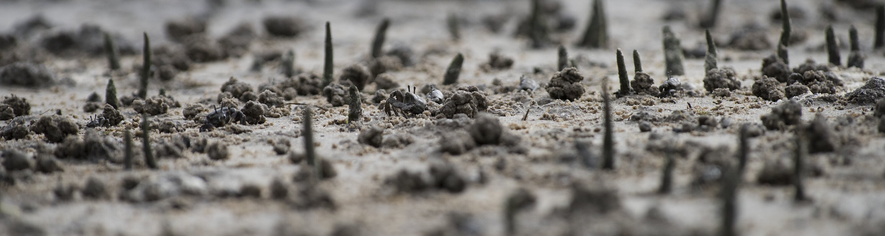 Semaphore Crabs wave their twisted claws in the air to signal to other crabs from the opening of their burrow. They live in vertical burrows with a terminal chamber. When the burrow is covered by water, they plug the end of the burrow with mud. They are communal, often forming groups, but will fiercely defend their own burrows. The claws of adult males are bigger than those of the females.