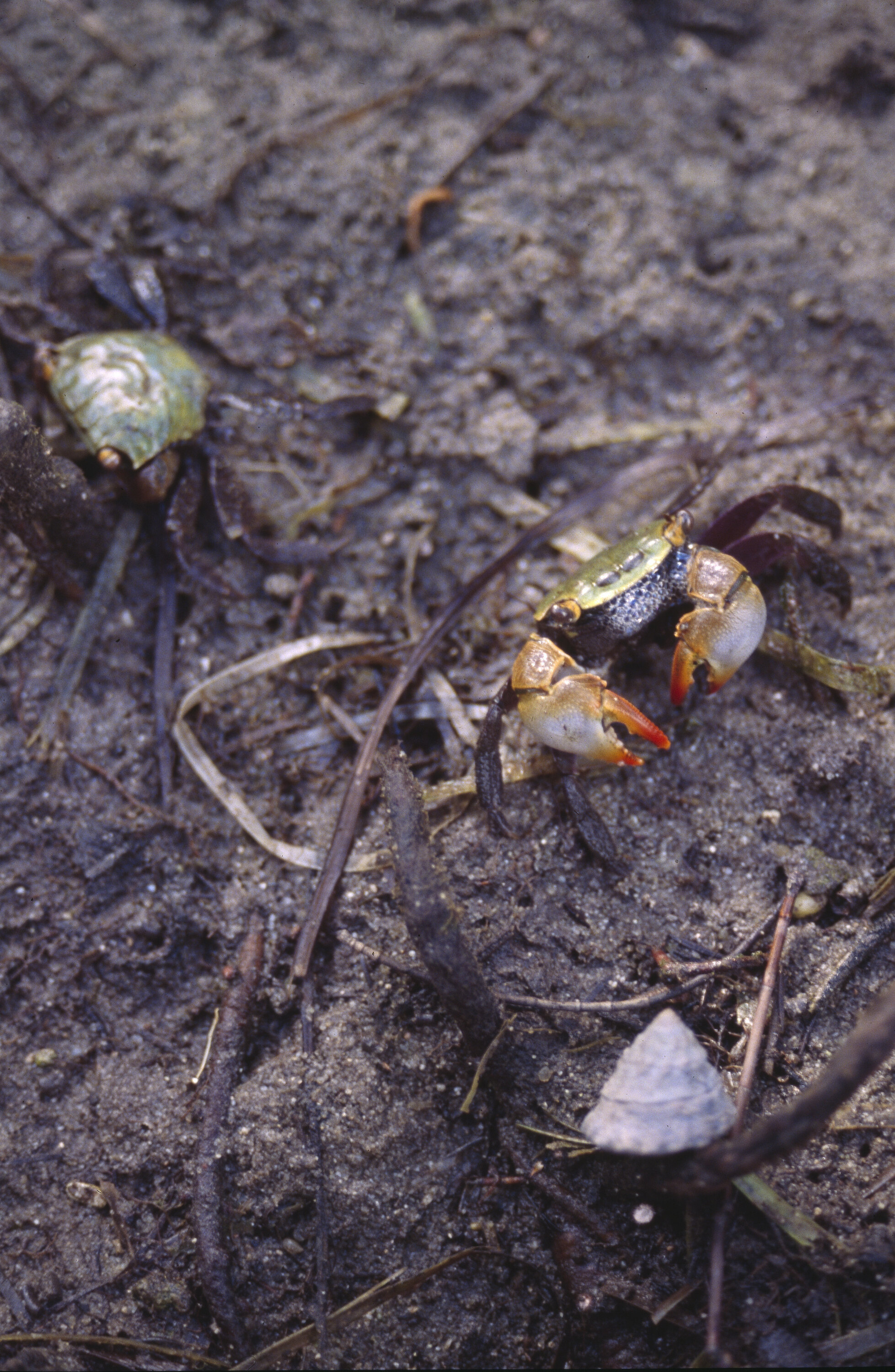 Red-fingered Shore Crabs live in burrows and emerge at low tide to forage for mangrove leaves. If threatened, they run to their burrows for protection.